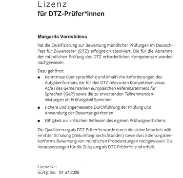 Als zertifizierte Prüferin helfe ich Ihnen, die Prüfungsstruktur , typische Aufgabenstellungen, Bewertungskriterien und Strategien für erfolgreiche Antworten zu verstehen. Im Unterricht trainieren wir alle Prüfungsteile: Hören, Lesen, Schreiben und Sprechen, damit Sie sich am Testtag sicher fühlen