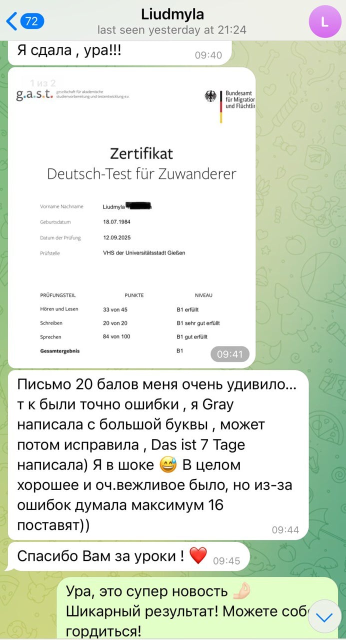 На занятиях мы тренируем все части экзамена: Hören, Lesen, Schreiben und Sprechen, чтобы вы чувствовали себя уверенно в день теста.